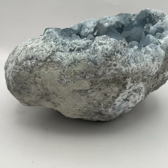 Experience the calming beauty of this Celestite Geode, a breathtaking natural formation weighing 6,955 grams (6.95 kg) and measuring approximately 9 inches by 5 inches. Mined in Madagascar, this striking geode features clusters of luminous sky-blue Celestite crystals that sparkle with celestial energy.