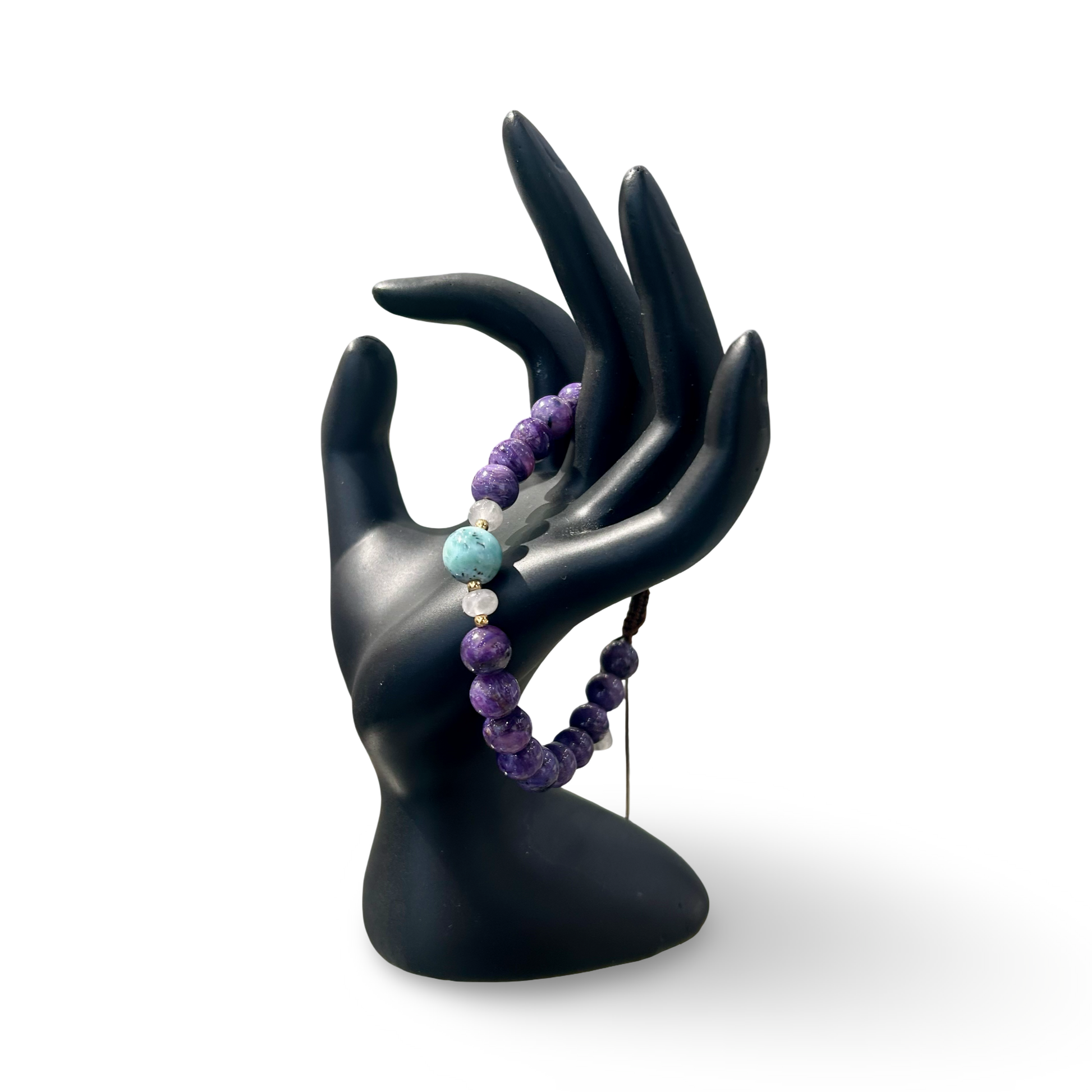 This elegant Charoite and Larimar bracelet combines two powerful stones of calm and transformation. Crafted with 8mm natural beads on an adjustable string, it offers both style and comfort while supporting emotional balance and spiritual growth.
