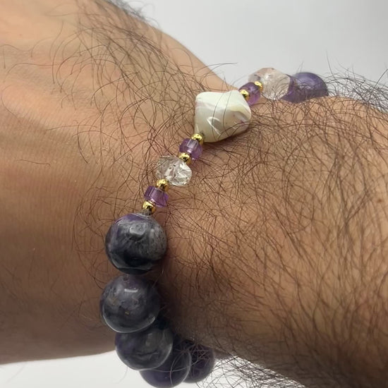 This handmade elastic bracelet beautifully combines Charoite, Mother of Pearl, and Herkimer Diamond for a truly radiant and high-vibration design. Featuring 14mm beads, this bracelet is crafted to fit medium to large wrists comfortably while adding a touch of natural luxury to any look.