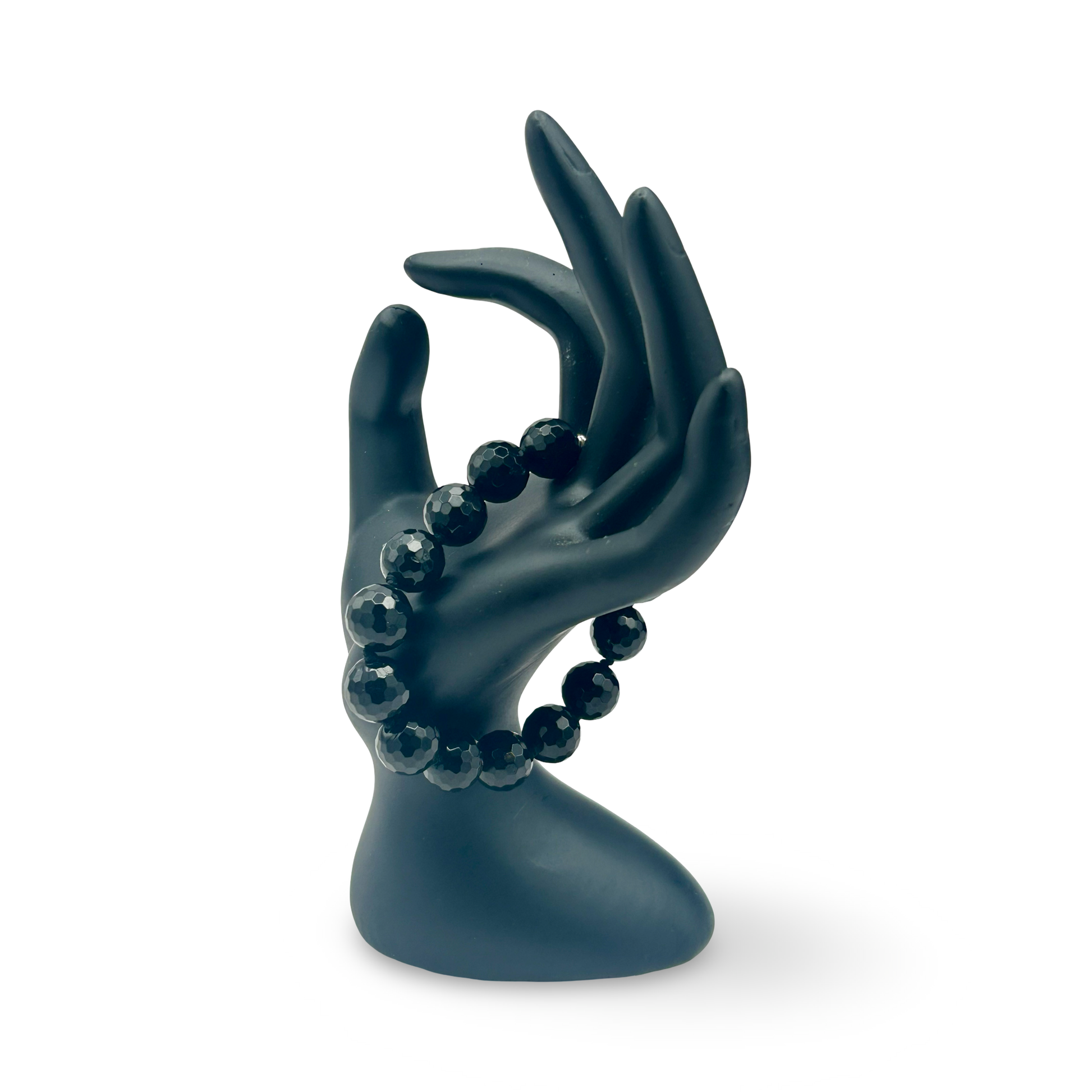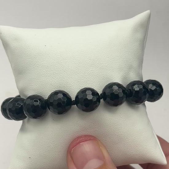 This handmade faceted Black Onyx bracelet features 10mm polished gemstone beads accented with sterling silver, offering a sleek and sophisticated look. Designed for a medium wrist, it combines elegance with everyday wearability.