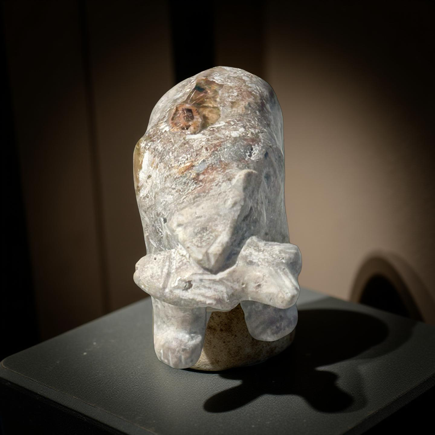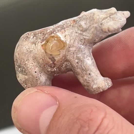 This striking fire opal bear figurine depicts a bear holding a fish in its mouth, carved from vibrant fire opal. Weighing 22 grams and measuring 2 inches by 1.5 inches, this piece captures the fiery brilliance of the gemstone. The bear symbolizes strength, courage, and protection, while the fish represents abundance and prosperity, making this figurine both beautiful and meaningful.
