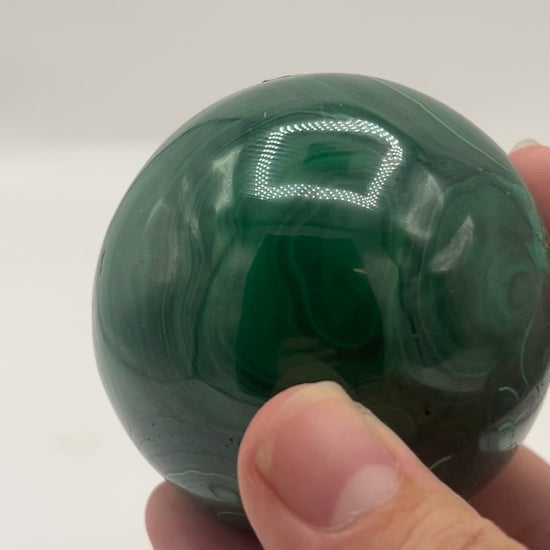 This exquisite Malachite sphere weighs 639 grams and measures 3 x 3 inches, showcasing mesmerizing concentric banding and vibrant green tones unique to top-quality malachite from the Congo. Polished to a flawless shine, it reflects Earth’s natural artistry and timeless elegance.
