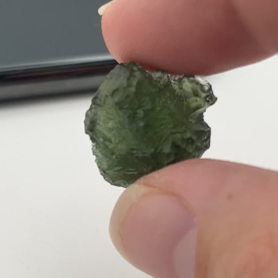 Connect with cosmic energy through this Moldavite, a rare natural tektite formed by a meteorite impact. Weighing 3.8 grams and measuring 1 inch by 0.5 inch, this small yet powerful crystal features a deep green hue and natural textured surface, perfect for meditation, spiritual work, or carrying as a personal talisman.