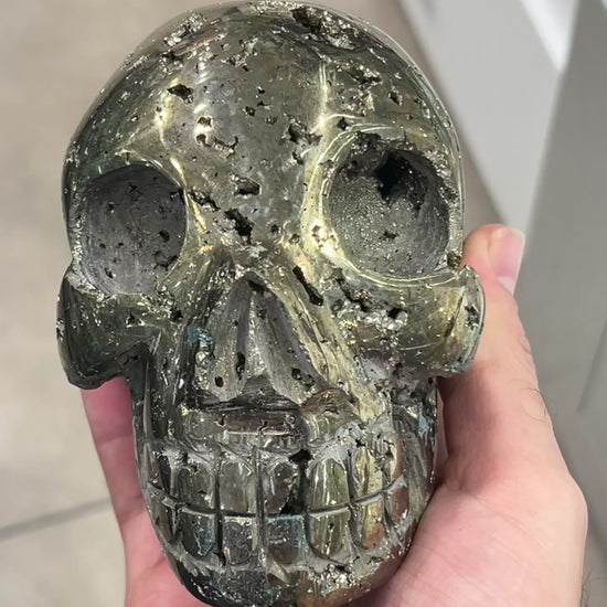 A museum-quality piece that captures the raw beauty and power of pyrite — a true statement crystal skull for your collection.