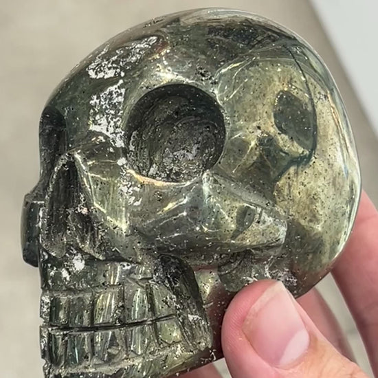 This stunning large pyrite skull weighs 1087 grams and measures 4 inches by 3.5 inches. Hand-carved from high-quality Peruvian pyrite, it features dazzling metallic luster and natural crystal formations that shimmer with every angle of light.