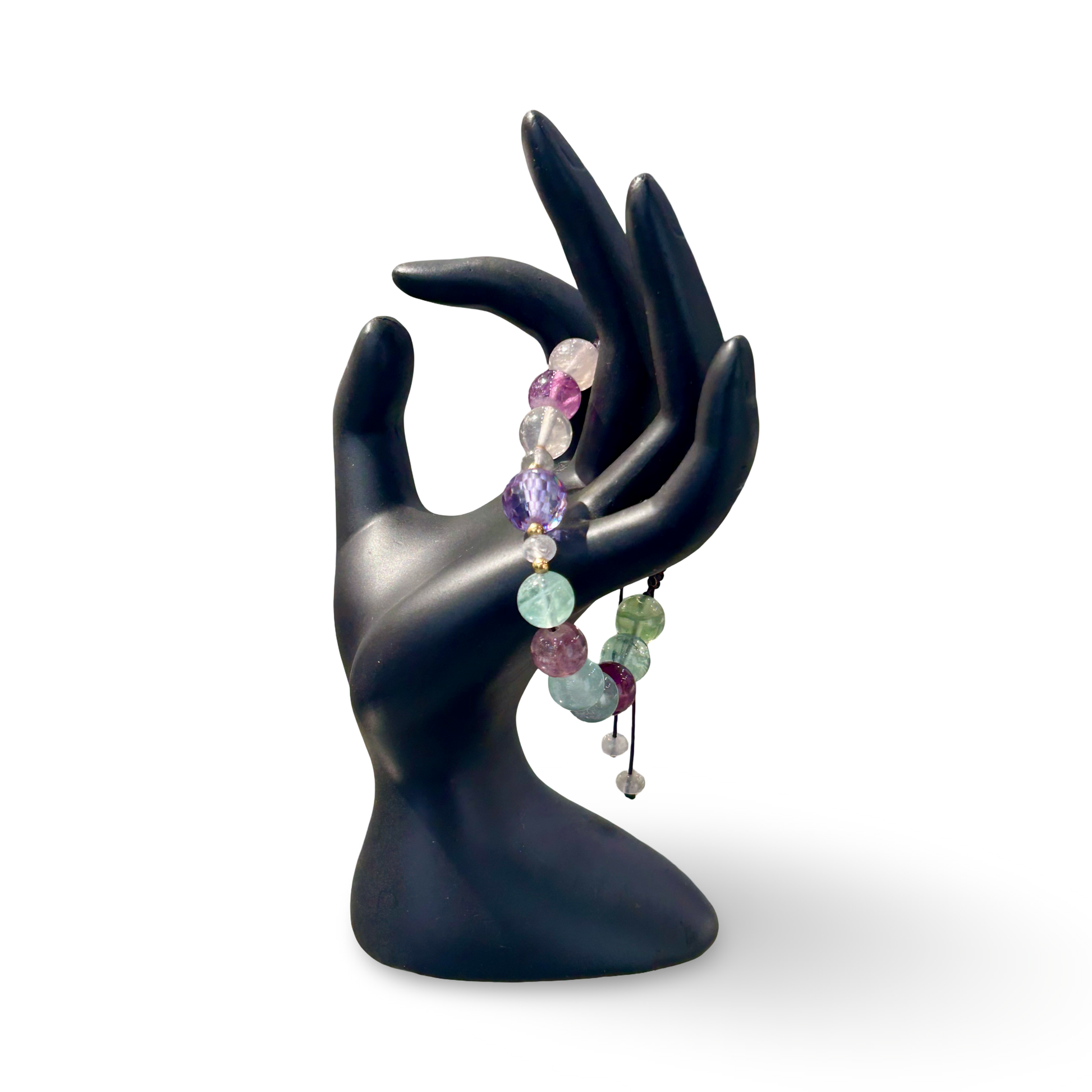 Handcrafted with 10mm Rainbow Fluorite beads and sparkling purple zirconia accents, this adjustable string bracelet combines vibrant color with a touch of elegance. Perfect for everyday wear, it fits most wrist sizes comfortably while promoting balance and clarity.