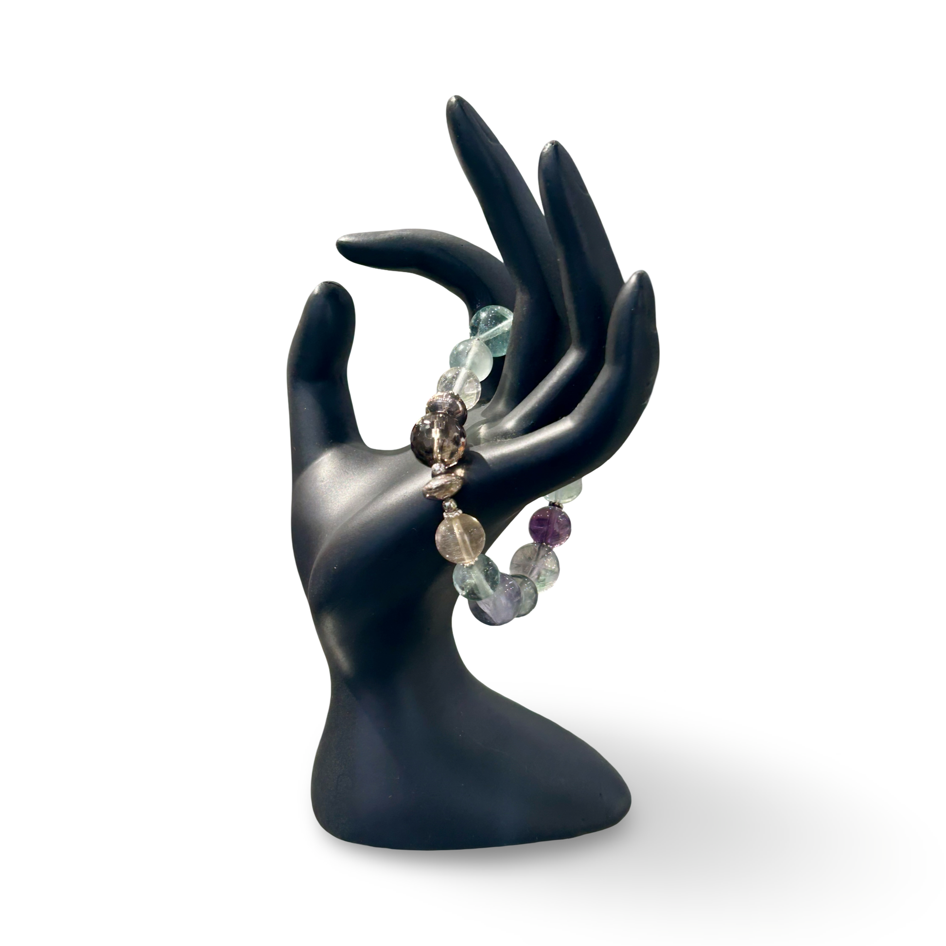 This Rainbow Fluorite bracelet is handcrafted with 10mm natural beads on a durable elastic band for a comfortable, easy fit. Its mix of purple, green, and blue hues brings clarity, balance, and positive energy to your daily life.