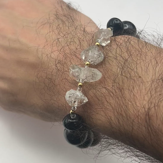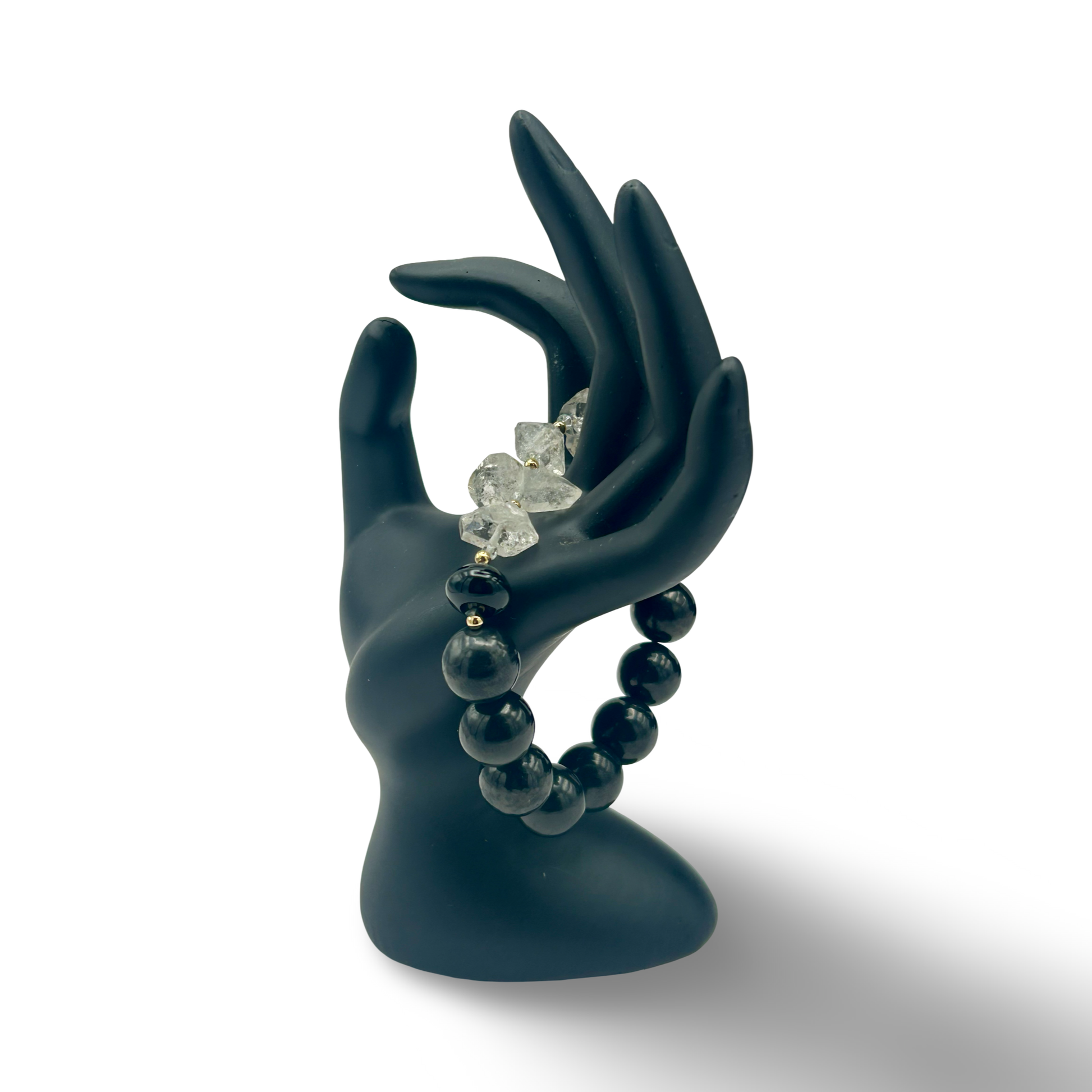 This handmade elastic bracelet combines the grounding power of Shungite with the high-vibration clarity of Herkimer Diamond, creating a piece that balances protection and light energy. Featuring 14mm natural beads, this bracelet is designed to fit large wrists comfortably while making a bold and elegant statement.