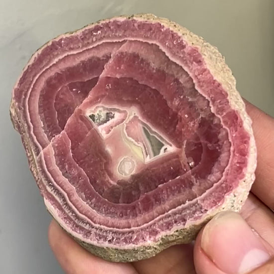 Enhance your crystal collection with this stunning Rhodochrosite Freeform from Argentina. Weighing 95 grams and measuring approximately 3 inches by 2.5 inches, this natural pink gemstone displays gorgeous banding patterns with soft peach, white, and blush tones.